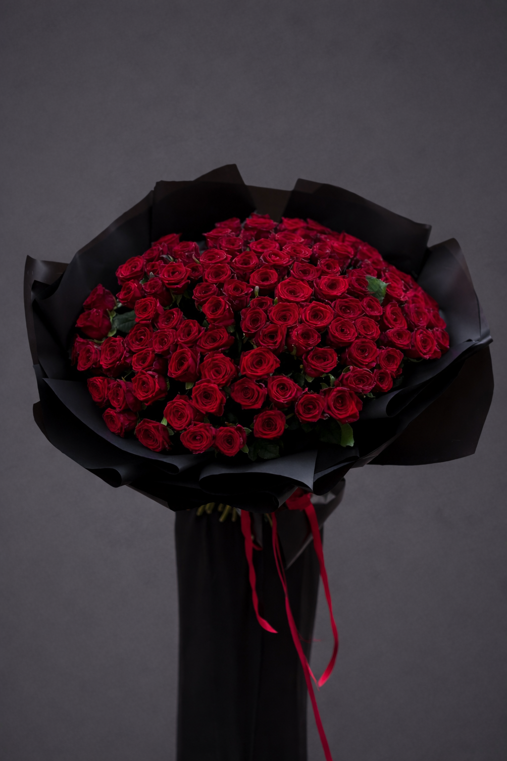 Глибокі оксамитові червоні троянди, зібрані у щільну монокомпозицію, створюють враження абсолютної досконалості форми.