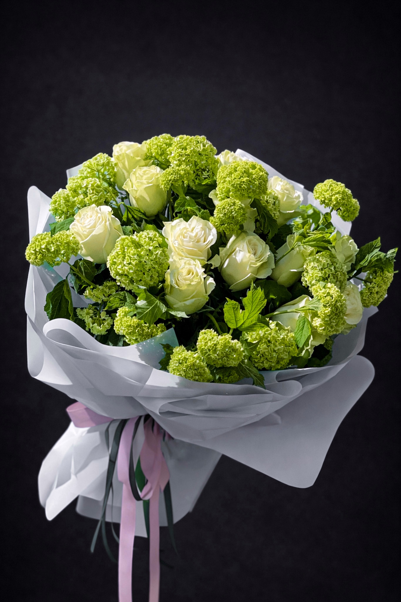 Втілення природної розкоші та витонченої елегантності. Благородне поєднання кремових троянд і соковитого зеленого вібурнуму створює відчуття свіжості, гармонії та високого статусу.