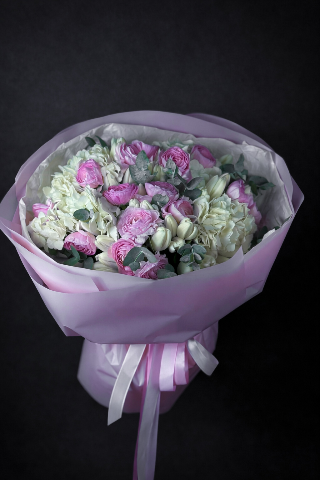 Повітряна біла гортензія створює відчуття легкості та чистоти, рожевий ранункулюс додає романтики, а витончені білі тюльпани наповнюють композицію гармонією та світлом. Свіжий евкаліпт завершує образ, надаючи букету благородної глибини та витонченості.