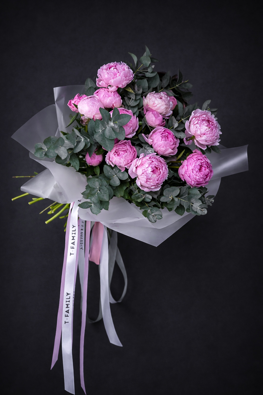 Символ витонченої жіночності, королівської ніжності та бездоганного смаку. Розкішні півонії в пудрово-рожевих відтінках у поєднанні з благородним евкаліптом створюють композицію, що випромінює спокій, статус і природну елегантність.