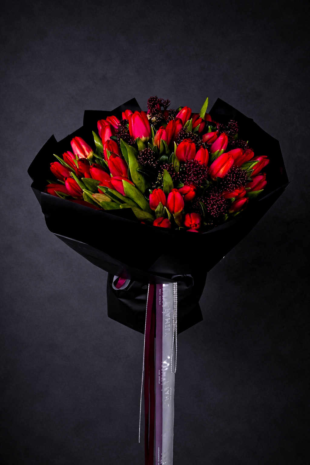 51 насичено-червоний тюльпан символізує щире кохання, захоплення та впевненість у своїх емоціях. Глибока бордова скімія додає композиції характеру, глибини та особливої драматичності.