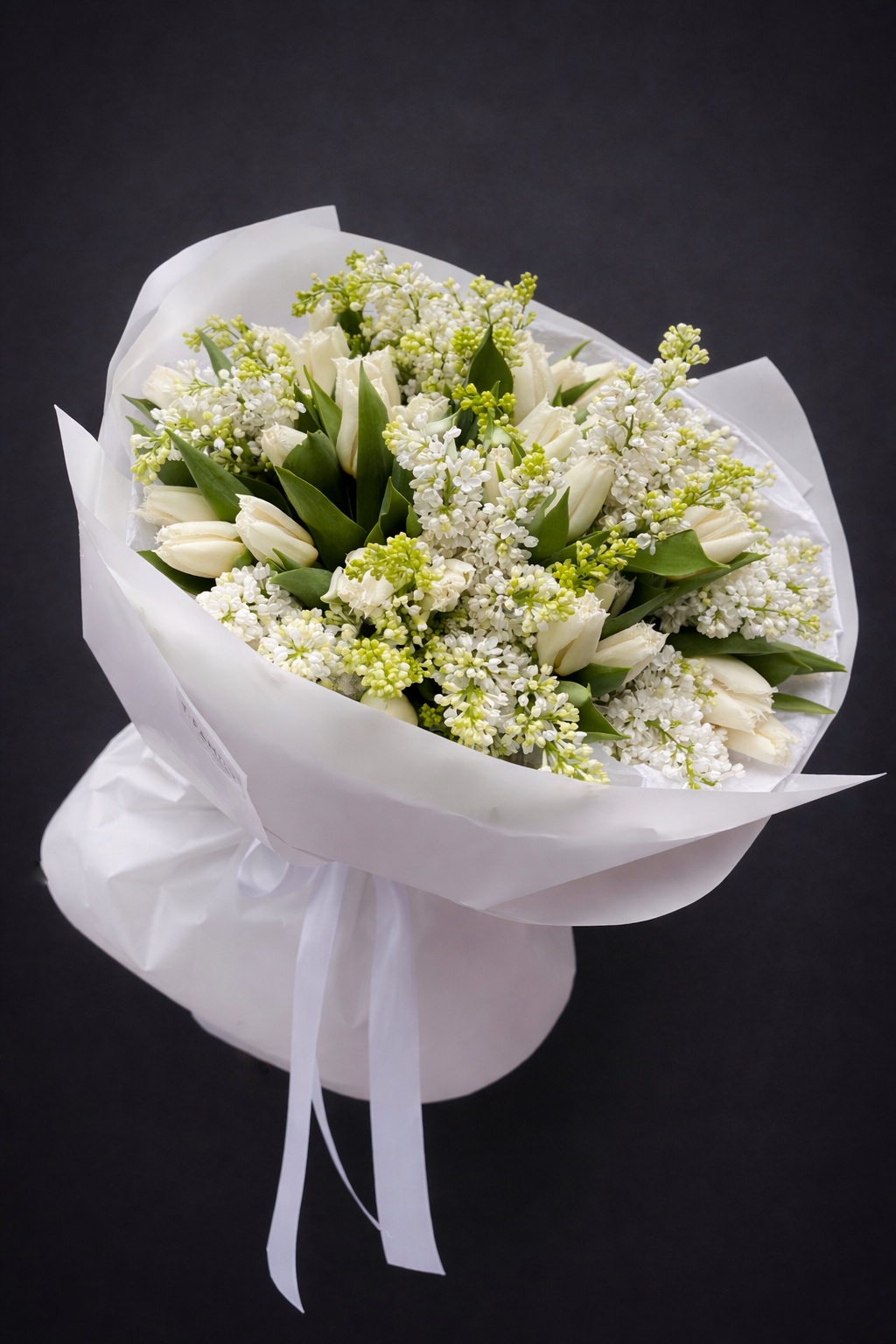 Білі тюльпани у поєднанні з ніжним бузком створюють композицію, що виглядає легкою, але наповненою характером. Свіжа зелень додає глибини, а повітряна форма підкреслює природну елегантність квітів.