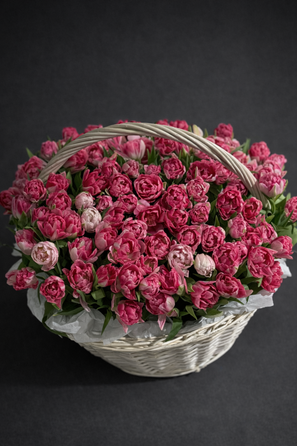 Глибокі малиново-рожеві відтінки, багатошарові пелюстки, що розкриваються як півонія, і щільний, королівський об’єм — композиція виглядає як квіткова коштовність.