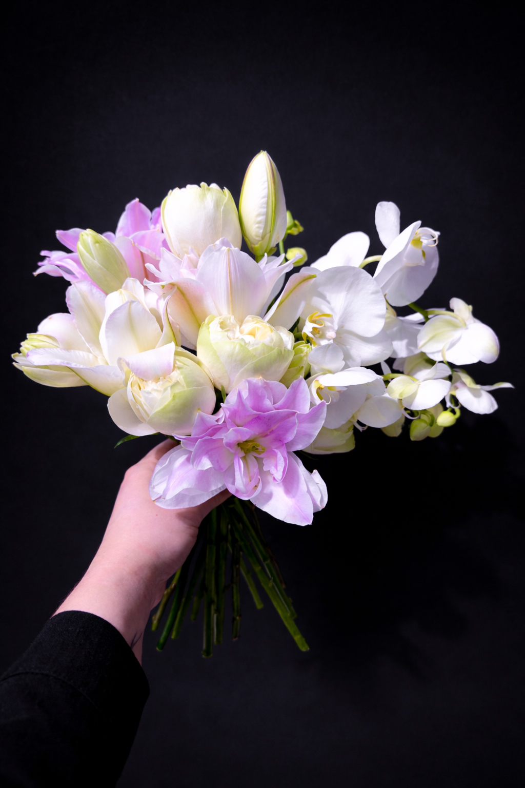Витончені орхідеї додають композиції делікатної розкоші, а півонієподібні акценти створюють відчуття свіжості, м’якості та природної гармонії.