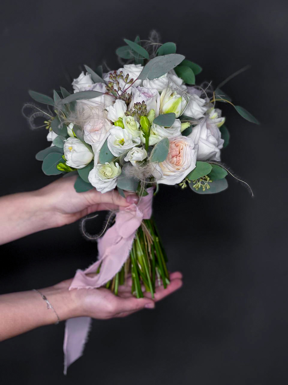 У композиції поєднані садові троянди, еустома, фрезія та евкаліпт, що створюють природну, легку форму з ефектом “щойно зібраного саду”. Повітряні текстури та м’які переходи відтінків додають букету глибини й особливої делікатності.