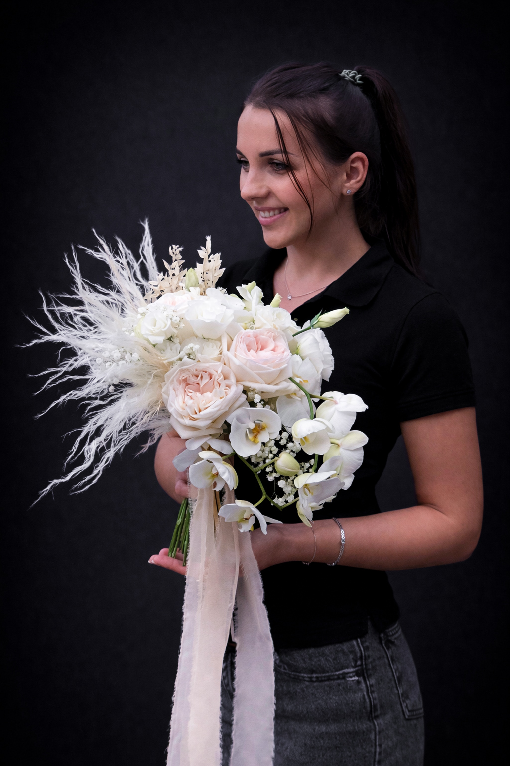Повітряні текстури сухоцвітів додають букету легкості та сучасного звучання, а довгі стрічки підкреслюють рух і романтичність образу.